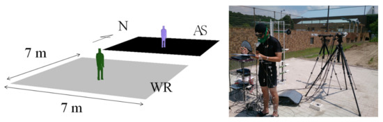 Test pavements were constructed at Okayama Prefectural University in Okayama. The campus is located at 34°41′32″ N, 133°46′54.5″ E in Japan’s western region, along the Seto Inland Seacoast. Okayama is known as the “land of sunshine” because of its minimal rain and mild climate throughout the year. Previously, evaporative cooling duration for the WR was reported to be a few days to one week [2]. Based on the data from the Japan Meteorological Agency, the average rainfall in Okayama during summer is 171 mm and 17 days for June, 160 mm and 17 days for July, 87 mm and 13 days for August, and 134 mm and 17 days for September; for practical applications, the amount of rainfall is considered sufficient for watering. The location of the test was an open space. The pavement materials used in the experiment were WR and AS. The WR pavement was made of water-retentive blocks composed of glass (10%) and ceramic (90%), and thus, it contained fine voids to hold water (water retention capacity ≥ 15 vol%). The general dimensions of the water-retentive block were: length × width = 100 mm × 200 mm, and thickness = 60 mm. Both pavements had an area of 7.0 m × 7.0 m, as shown in Figure 1.