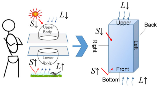 where ↓ indicates the downward components and ↑ indicates the upward components. To represent the effect of the direction of irradiation and the size of the person on the net radiation, the person was simplified to a floating rectangular shape facing the sun, as shown in Figure 2. Upward and downward solar radiation and infrared radiation were then calculated as