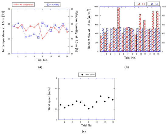 Physical environmental quantities including air temperature, humidity, solar and infrared radiation, and wind speed were measured. Air temperature and humidity were measured at heights of 0.35 m, 0.5 m, and 1.5 m from the surface using a capacitive thermo-hygrometer recorder (TR-73U, T&D Corporation, Nagano, Japan). The solar radiation and infrared radiation in upward and downward directions were measured at a height of 1.5 m using a net radiometer (MR-60, EKO, Instruments, Tokyo, Japan). The wind speed was measured at a height of 1.5 m using a hot-wire anemometer (Climomaster Model-6531, Kanomax Japan Inc., Tokyo, Japan). A measurement height of 1.5 m was selected to indicate the pedestrian height [12,16]. To understand the effect of the height on the environment, near-surface values at 0.35 and 0.5 m were measured for temperature and humidity. Every environmental quantity was measured and recorded at 1 min intervals using a data-logger (LR-8400, Hioki E.E. Corp., Nagano, Japan).