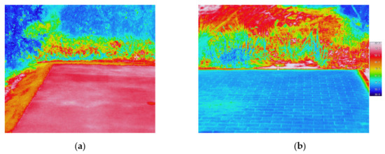 Thermal images of both pavements (at 10:20 a.m. on 26 August 2016): (a) AS and (b) WR.