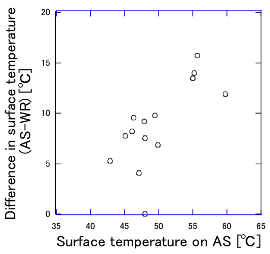 The surface temperatures of both pavements were compared using infrared images, as shown in Figure 4. The surface temperature was uniformly distributed over the surface. Using the thermocouples, the average surface temperature of AS and WR during the experiments was measured to be 50.2 ± 5.0 °C and 40.7 ± 2.9 °C, respectively, and this difference was found to be significant (p < 0.001, d = 2.38). The performance of WR is analyzed in Figure 5. The surface temperature difference varied approximately linearly with the surface temperature on AS, so the effectiveness of surface temperature reduction could be assessed completely.