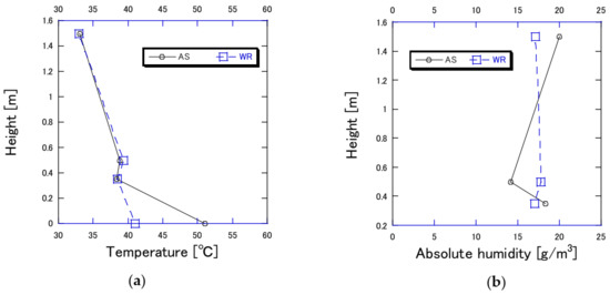 The vertical profile over the pavements: (a) temperature and (b) absolute humidity.