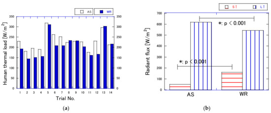 The sensible and evaporative heat loss did not show a significant difference because air temperature, humidity, and wind conditions experienced by the participants on both pavements were similar. The net radiation consists of the effects of solar radiation and infrared radiation. Because Rnet↓ is dependent on climatic radiation, Rnet↑ can reflect pavement effects. In Figure 7b, the reflected solar radiation S↑ of WR was significantly larger and the infrared radiation L↑ of WR was significantly smaller than that of AS. As the infrared radiant emission is proportional to the fourth power of the temperature, the infrared radiation from WR was lower as the surface temperature level was lower. It is likely to have had a negative impact on the participants due to the increased reflected solar radiation, especially under strong solar radiation. This suggests that an optimum reflectance value for reducing Rnet↑, namely human thermal load, should be examined for environmental design.