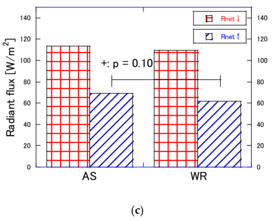 The air temperature, humidity, solar and infrared radiation, and wind speed measured at a 1.5 m height during the experiment are shown in Figure 3. The average values (mean ± s.d.) of these physical quantities measured over AS were as follows: air temperature (33.3 ± 1.4 °C), humidity (53.2 ± 7.0% R.H.), global solar radiation (583 ± 237 W/m2), infrared radiation from the sky (520 ± 13 W/m2), and wind speed (0.79 ± 0.18 m/s). The average maximum temperature in late August in Okayama is 32.7 °C, based on the database from the Japan Meteorological Agency. The global solar radiation showed some fluctuation because of the condition of cloud cover. However, other variables were mostly stable. Thus, the overall climatic conditions during the experiment can be considered as typical of summer weather.