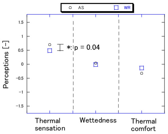 The mean value of each perception is shown in Figure 8. In the case of AS, the thermal sensation was +0.69, wet sensation was +0.04, and comfort sensation was −0.33. In the case of WR, the thermal sensation was +0.48, wet sensation was −0.02, and comfort sensation was −0.14. The participants found that the environment was hot and uncomfortable overall. There was a trend towards reporting a cooler sensation on WR (p = 0.04, d = 0.31), and WR did not significantly affect other perceptions. Interestingly, no difference in wet sensation was induced on WR, even when the participant stood on the wetted WR surface.