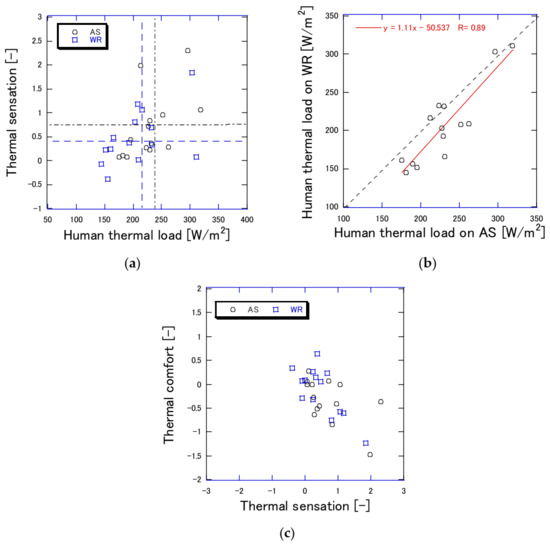 Relationships among the human thermal load, thermal sensation, and thermal comfort: (a) human thermal load and thermal sensation on AS and WR, (b) comparison of human thermal load of AS and WR, (c) thermal sensation and thermal comfort on AS and WR.