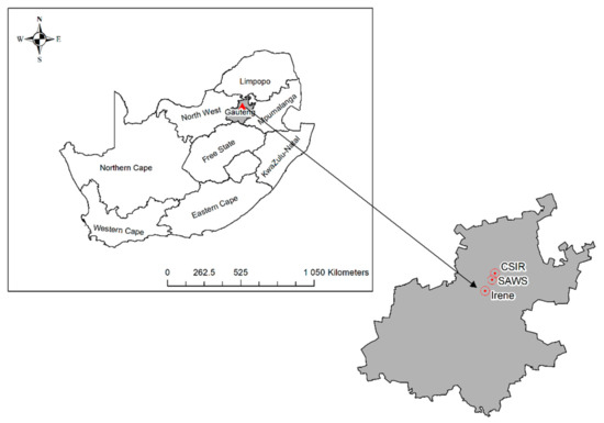 Pretoria is situated on the inland plateau of South Africa in the Gauteng province at approximately 1300 m above sea level (Figure 1). The city experiences cool, dry winters and long, hot summers with rainfall occurring during the summer months. Pretoria was selected as the study area due to the known high levels of tropospheric ozone related to industrial activities [12,20] and the impact of the biomass burning season on aerosol distribution [21]. Data were collected from three stations, namely the South African Weather Service (SAWS) Bolepi House, SAWS Irene, and the Council for Scientific and Industrial Research (CSIR) head office due to their relative proximity to one another. The three different stations were located between 1322 m and 1529 m above sea level. The CSIR and Irene stations are approximately 18 km apart, while Bolepi House is approximately 6 km from the CSIR.