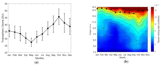 Tropospheric ozone data obtained from ozonesondes launched at Irene: (a) Monthly mean and standard deviation of the total tropospheric ozone column obtained from ozonesondes between 1998 and 2018; (b) Monthly mean ozone mixing ratio from 1.5 to 16.5 km above sea level and monthly mean lapse-rate tropopause obtained from ozonesondes between 1998 and 2018 (dashed black line).