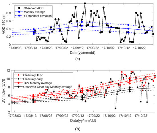 (a) Daily AOD values at 340 nm from August to October 2017 as recorded by the AERONET station at the CSIR and the monthly AOD averages and standard deviations (during the 2011–2018 period); (b) Daily modelled clear-sky UVI and modelled and observed clear-sky monthly averages and standard deviations from August to October 2017.