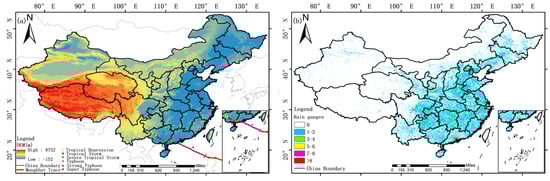 Mainland China covers a total land area of about 9.63 million km2, with an elevation ranging from −152 to 8752 m, bounded by 18° N–55° N latitude and 73° E–136° E longitude. Figure 1a shows the terrain of mainland China and the tracks of typhoon Mangkhut. The terrain is characterized by a westward high elevation and an eastward low slope to the ocean, which is conducive to moist air currents over the ocean that penetrate deep into the inland region and form precipitation. Eastern China is a monsoon climate zone, while the northwest, far from the sea, is a non-monsoon zone with a temperate continental climate. Over southeastern and southern China, subtropical monsoons coupled with orographic effects from complex terrain usually cause substantial precipitation [25]. Moreover, the monsoon which moves back and forth between the Siberia Mongolian Plateau and the Pacific Ocean has a primary influence on the climate of southeastern and southern China, and its seasonal propagation contributes to the formation of typhoons in the western Pacific Ocean and their landfall in southeastern and southern China [26]. Furthermore, the annual distribution of precipitation in southern China is uneven, with July to September dominated by TC-generated precipitation [27]. TCs not only lead to economic losses but also cause natural disasters such as heavy rainfall, urban flooding, and landslides.