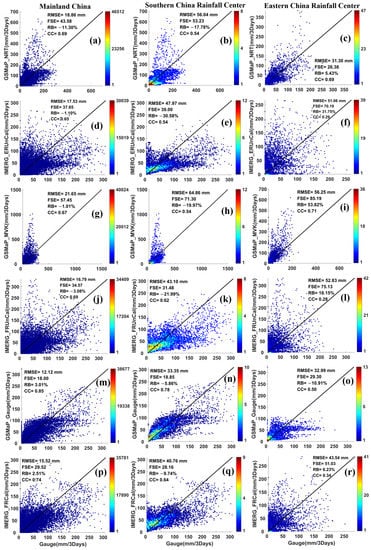 Scatter plots of 72 h of accumulated precipitation between satellite products (the satellite-only GSMaP and IMERG products for (a–l) and their gauge-corrected products for (m–r)) and gauge observation over different areas during typhoon Mangkhut for rainfall centers over mainland China (the 1st column), southern China (the 2nd column), and eastern China (the 3rd column).