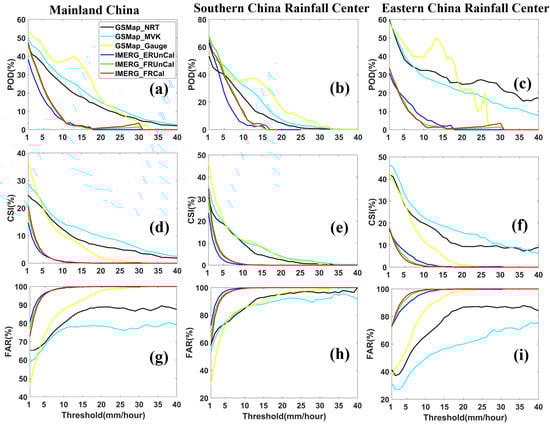 Contingency statistics computed from the Global Satellite Mapping of Precipitation (GSMaP) and Integrated Multi-satellitE Retrievals for Global Precipitation Measurement (IMERG) hourly precipitation products over mainland China and two rainfall centers: (a–c) Probability of Detection (POD), (d–f) Critical Success Index (CSI), and (g–i) False Alarm Ratio (FAR).