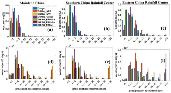 Probability distribution function by (a–c) occurrence (PDFc) and (d–f) volume (PDFv) of hourly precipitation for different intensities over mainland China and two rainfall centers.