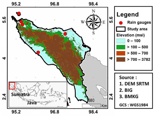 The study area and topography for the Northern parts of Sumatra Island (Aceh Province), Indonesia.