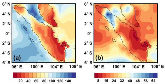The northern part of Sumatra Island (or the Aceh province) is located between 95° E–98° E and 20° N–60° N (Figure 1). The area of the Aceh Province is about 58,377 km2. It is located southeast of the Andaman and Nicobar Islands, India, separated by the Andaman Sea, and to the west of the Malaysian Peninsula, separated by the Strait of Malacca. Aceh is also bordered by the Bay of Bengal and the Indian Ocean in the northwest and the west. This region’s topography is characterized by the high-rising topography of the Bukit Barisan Mountains, with the highest elevation at 3782 m above means sea level. Because of the land-sea contrast and the high topography, northern parts of Sumatra have complexity in climate profile [,]. The rainy season usually comes during MAM and SON, while the dry season always occurs during DJF and JJA []. The southeast monsoon prevails in JJA, while the northwest monsoon occurs in December–January–February (DJF) []. The transition between monsoons occurs during March–April–May and September–October–November (SON) [].