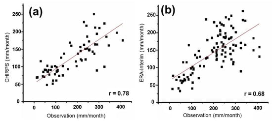 Scatter plot and the Pearson’s correlation between observed precipitation (3 stations) and (a) CHIRPS and (b) ERA-Interim in JJA from 1981 to 2016.