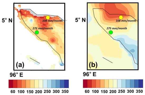 Climatological-mean precipitation (mm/month) in JJA averaged over 1981–2016 based on; (a). CHIRPS; (b) ERA-Interim. Meulaboh (in the west part) and Lhokseumawe (in the east part) stations are marked by green and yellow circle, respectively.