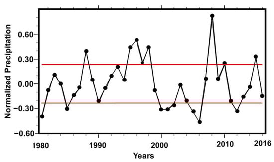 Normalized precipitation anomaly index over the study area from 1981 to 2016 during JJA based on ERA-Interim. The red line (__) represent the range of 0.8 standard deviation.