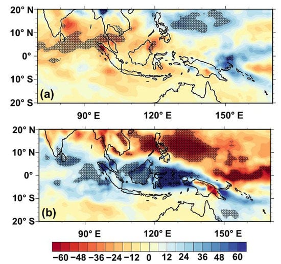 During the dry years, significant negative anomalies were seen in the equatorial Indian Ocean between 90° E and 110° E (including the study area), the South China Sea (SCS), and the Celebes Sea, whereas positive anomalies were observed in the Philippine Sea (Figure 6a). In Sumatra Island, the negative precipitation anomaly appears in the northern part of the island (i.e., the Aceh province). In the wet years, the t-test shows positive anomalies over the Indian Ocean, the study area, and most parts of the Maritime continent (Figure 6b). By contrast, a band of significant negative anomalies was located in the north, spreading eastward from the Indochina Peninsula to the Philippine Sea. We can notice a reversed precipitation anomaly between Indonesia and the Philippines Sea in both dry and wet years.