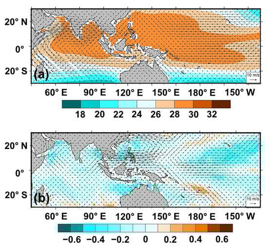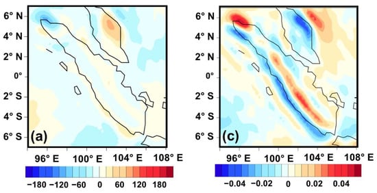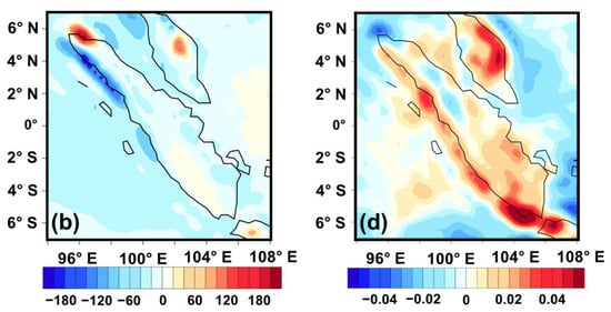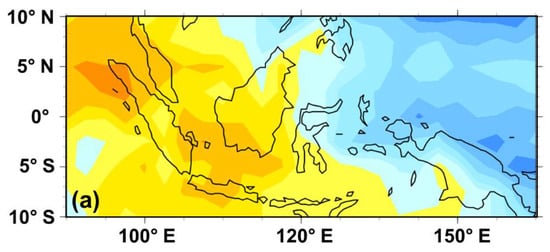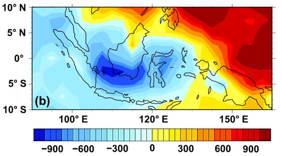 Other terms such as horizontal moisture advections  and , , and evaporation anomaly E’ are all positive but with much smaller magnitudes. The residual term in the moisture budget is positive but small (not shown). In summary, the negative precipitation anomaly is mainly balanced by the dynamic process via , which implies the weakening of tropical convection and the corresponding circulation [,]. We further examined the spatial distribution of  surrounding the study area (Figure 10a). For brevity, most parts of the Sumatra Island are associated with negative  A strong negative anomaly of  is noticed over the study area, consistent with the local negative precipitation anomaly in the study region. Furthermore, there is an agreement between the pattern of the anomaly of  and the anomaly of vertical velocity () (Figure 10b). It again reflects that the negative precipitation anomaly is caused by weakened upward motions over these areas.