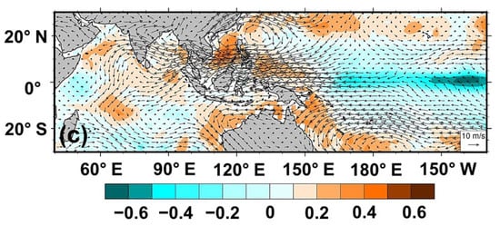 As the background flow in JJA, the dry air from the winter continent (Australia) flows across the Equator toward the Northern Hemisphere (Figure 7a) []. In the dry years, the anomalous westerly wind appears over the Bay of Bengal and extends eastward to merge with the Philippines Sea’s cyclonic anomalies (Figure 7b). A southwesterly anomaly is observed over the tropical eastern Indian Ocean to the west of northern Sumatra. These anomalous circulations are parts of the anomalous cyclonic circulation prevailing over the Indochina Peninsula, the SCS, and the Philippine Sea. Meanwhile, in the wet years, a strong anomalous anticyclonic circulation covers South Asia, the Indochina Peninsular, and the Philippine Sea, with easterly anomalies stronger than the long-term westerly flow prevailing from the tropical western Pacific to the tropical Ocean (Figure 7c). Note that the wind anomalies are much more robust in the wet years than in the dry years. A comparison of the circulation anomalies presented above reveals a close relationship between the Asian Summer monsoon and precipitation in northern Sumatra in inter-annual time scale. An enhanced and weakened Asian summer monsoon trough appears in the dry and wet years, respectively.