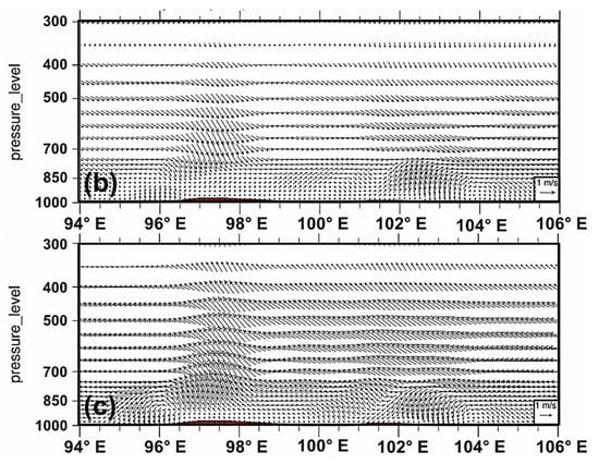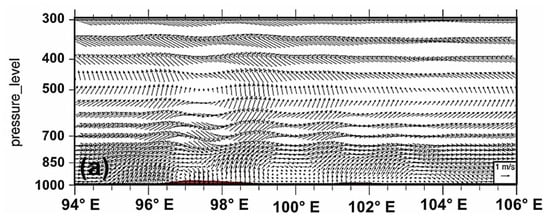 Jiang and Li (2017) found that orographic lifting is the primary forcing for the anomalous vertical motion over the Maritime Continent (MC) []. To describe the mountain lifting effect clearly, we plotted the zonal-vertical cross-section of zonal overturning circulation averaged over a latitude band (4° N–5° N) (Figure 8). Based on the climatology of the cross-section of meridionally-averaged horizontal wind in Figure 7a, the westerly winds appear as the background flows supported by the Asian-Australian Monsoon (Figure 8a). It is clearly observed that the mountain ridge on the west coast of Sumatra is located around 96° E–99° E (Figure 1). The low-level westerly winds encounter the mountain ranges and are raised on the windward side. The ascending motion is around the mountain top, and the convection-circulation-moisture feedback related to the lifting would enhance the precipitation along the coast []. A branch of descending motion is observed over the top and leeward side of the mountains in the east, followed by a region of ascending motion further to the east over the eastern coast of northern Sumatra (Figure 8a). Evidently, the overall zonal overturning circulation (westerly in the lower troposphere, easterly in the upper troposphere, and upward motion in between) is disrupted by the mountain ranges in northern Sumatra, which creates a relatively dry region over the mountains (Figure 8a).