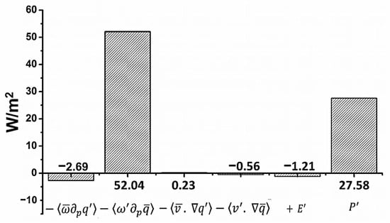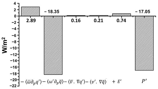 where () denotes climatological mean, which is defined as the mean over 1981–2016. Here (’) represents the departure from the climatological mean. E is evaporation,  is vertical pressure velocity,  is horizontal velocity,  is specific humidity and . The last term () represents the contributions of nonlinear transient eddies, which are generally not part of the physical solution because their magnitudes are much smaller compared to the other terms. There are five terms in the moisture budget, as shown in Equation (1). In (1), precipitation anomalies are roughly balanced by the anomalous vertical moisture transport associated with a mean () and anomalous () vertical motion, horizontal moisture transport anomalies, evaporation anomalies, and  term that includes transient and nonlinear terms (relatively small and often neglected) (Figure 1). Each of the terms is converted to the energy units by absorbing the latent heat per unit mass. The P is precipitation in energy units (W/m2), divided by 28 to become mm/day []. The vertical integral from 1000 to 300 hPa is computed in this study. Vertical integral ⟨ ⟩ denotes a mass integration from 1000 to 300 hPa: