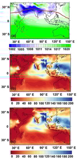 The figure below shows the Intertropical Convergence Zone (ITCZ) during JJA periods overlaid by the mean of Sea Level Pressure from 1981 to 2016 (Figure 13a). The shift of ITCZ from south to the north is linear to the low sea level pressure. Based on Figure 13b,c, most of the precipitation occurs over the Philippine Sea and Bay of Bengal, triggered by low sea level pressure around those locations.