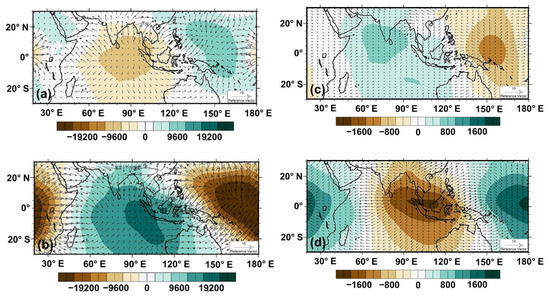 Velocity potential and stream function are clearly appearing at the equator, which is very powerful for model initialization in tropical regions. Since velocity potential is proportional to divergence, then it can be applied to track regions where convection is enhanced []. Furthermore, velocity potential can easily be used to determine the large-scale horizontal convergence or divergence []. For calculating the velocity potential and stream function, we used the  and  component of horizontal wind and  specific humidity from ERA-Interim. First, we calculated the stream function and velocity potential (“uv2sfvpf” function in NCL). Second, we determined the divergence wind components (“uv2dvf” function in NCL).