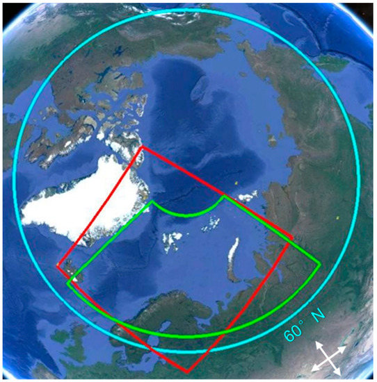 - The COSMO-CLM configuration of the COSMO model: version 5.06; grid spacing 6.6 km; 40 vertical levels; computational domain (countered at the Figure 2 by the red) includes the Greenland, Norwegian, and Barents seas and parts of the Greenland, Kola Peninsula, Kara Sea, and North Pole area. Further in the text, we will refer to it as “COSMO-CLM-A6.6”.