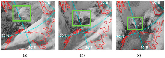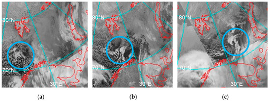 Consecutive satellite images of the polar low, which originated on 24 February 2020 off the coast of Svalbard: (a) 14:00 UTC 24.02; (b) 09:00 UTC 25.02; (c) 04:00 UTC 26.02. Images available from the Antarctic Meteorological Research Center (AMRC).