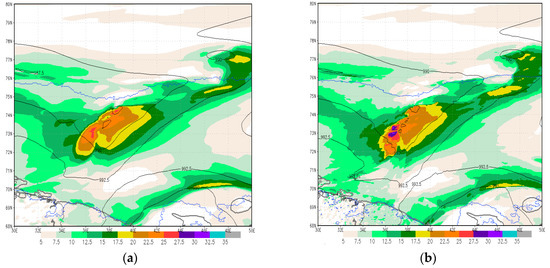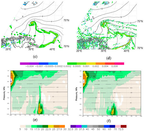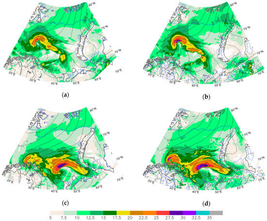 In Figure 4b,d, in comparison with the satellite images (Figure 3) and scatterometer data (Figure A1), we see the simulation of close scenarios of PL development by COSMO-CLM-A6.6 and ICON-A6.5. However, we can suppose that the ICON predicted the minimum of sea-level pressure at the center of PL and the cyclonic movements a little better than the COSMO-CLM did. It is likely that he closed contours of pressure lines better correspond to the transition from the comma to the spiral structure phase of this PL (Figure 5b). According to the ICON results, the wind speed at the center of the PL reached 17.5–20 m/s, the ones from COSMO-CLM were in the interval of 15–17.5 m/s, and the scatterometer data were in the interval of 35–40 knots (approximately 18–21 m/s) (Figure A1).