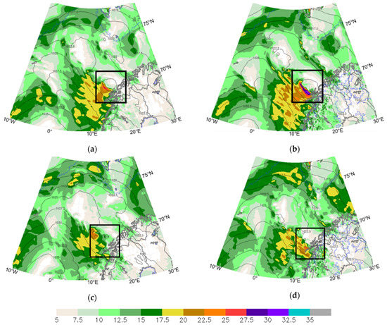 The sensitivity of the modelling accuracy to increases in the forecast lead-time in this case has been studied on the basis of numerical experiments with different base times and lead times for the same valid time. The results can be seen in Figure 6; with a lead time of 36 h, both models (started 1 day before) produced approximately the same values for wind gusts, but with different locations of the PL (Figure 6c,d) and more intense PL destruction near Scandinavian coast (for COSMO-CLM, which was additionally quicker) for a lead time of 12 h than were seen in reality.