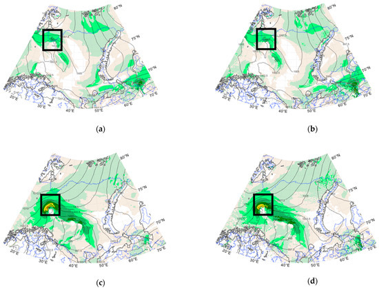 The differences in air temperatures between the sea surface temperature and the temperature at 500 hPa (exceeding the threshold 41.4 K) and 700 hPa (threshold 22.8 K) are the criteria for identifying the possibility of PL initiation [7]. Both of these criteria are satisfied in the area of polar low occurrence (Figure A3). The area in which the second criterion (Tsea-T700) is satisfied is much more extensive than the area of the first criterion (Tsea-T500) (see Figure A3). Additionally, it can be seen that the area of the criterion for (Tsea-T500) corresponds to the full lifetime of this PL.