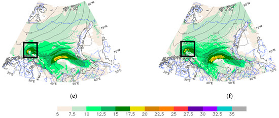 According to the simulations, the wind speed in the PL ranges from 20 to 22.5 m/s at 19:00 UTC, 26 November, while the PL deepens (Figure 7c,d). It is noteworthy that a synoptic-scale cyclone can be seen to the east of the polar low in the Barents Sea, which is confirmed by the satellite imagery (Figure 3c). This then shifts to the south of Novaya Zemlya. At 00:00 UTC, 27 November, the wind speed in both cyclones ranges from 17.5 to 22.5 m/s. By 05:00 on 27 November 2019, the PL approaches the coast of the Scandinavia, where the wind speed decreases, and the atmospheric pressure rises (Figure 7e,f).