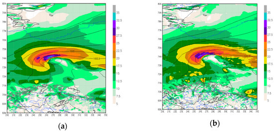 According to the ASCAT data [33], the surface wind speeds reached 15–17.5 m/s at 18:00 on 26 November (in the ASCAT data, 35 knots corresponds to 18 m/s), while, according to the model, they ranged from 17.5 to 22.5 m/s. Most likely, this indicates that the higher resolution of the model (6.5 and 2 km) compared to the ERA5 reanalysis and the ASCAT scatterometer (the resolution of which is 25 km) allows obtaining a more detailed wind field near the center of the polar low. The data of ERA5 and ASCAT can be found in Figure A1.