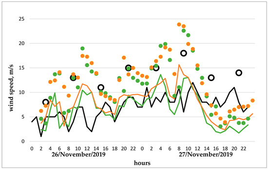 ICON-A6.5 and ICON-A2: 10 m wind speed and wind gusts in Honningsvåg (71°01’ N, 25°59’ E) on 26–27 November 2019, according to observations and forecast. Black: observations; orange: “ICON-A6.5”; green: “ICON-A2“. Curves show the 10 m wind speed, points and circles show the wind gusts values. Gray rectangle shows the time period of the PL appearance near the coastline and the meteorological station area.