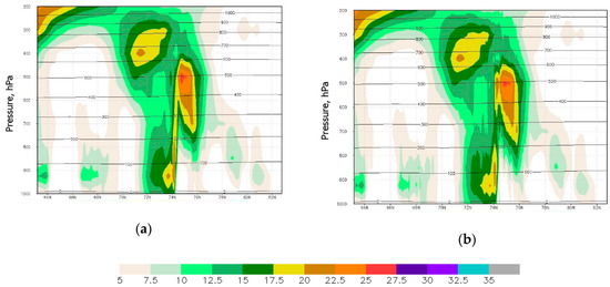 Figure 18 shows the cross-section along 69.5° N. Figure 18 gives us an impression that both the model configurations simulated the PL as independent circulation system, without explicit interaction with the powerful jet stream located at heights. As for the other PL cases analyzed, ICON-A2 simulates a smaller area of strong winds inside PL and makes its structure more detailed. Both versions of the model predicted comparable heights of the PL: in the most active stage, it reached heights of 800 hPa. The small dimension of PL strengthens the complexity and importance of its numerical prediction.