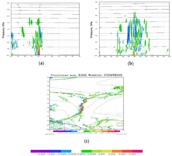 ICON-A2 relative vorticity (1/s): (a) profile along 73° N; (b) profile along 38.5° E; (c) vorticity map at H1000. Valid time, 06:00 UTC 26 February 2020.