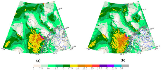 Figure 14 shows the forecast of wind gusts produced by two model configurations. It can be seen that while the wind speeds only in some regions exceed 17.5 m/s, the wind gusts reached 32.5 m/s, which is considered to be a dangerous value in terms of synoptic classification. The formed comma cloud structure was formed on the evening of March 19 (Figure 5), but the wind speed did not exceed 15 m/s (gusts reached 22.5 m/s). By the morning of 20 March, the wind speed exceeded 17.5 m/s and the wind gusts reached 32.5 m/s (Figure 14).
