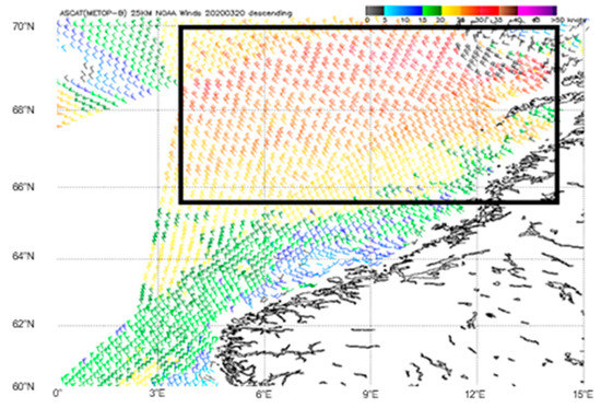 Figure 15 presents the satellite data for the 10 m wind speed obtained from ASCAT for 11:00 UTC, 20 March. It shows that the polar low reached a large size near the Norwegian shoreline and the 10 m wind reached 35 knots, corresponding to 18 m/s. These values should be compared not with the gusts presented in Figure 14, but with the wind speed shown in Figure A5. As shown in the forecast of ICON-A6.5 for valid time 12:00 UTC, the wind speed ranges from 17.5 to 20 m/s. To the south of the polar low center, the wind speed does not exceed 12.5–17.5 m/s. These values correspond well with the ASCAT data.