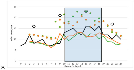 A noticeable increase in the 10 m wind speed and gusts was observed at some coastal and island meteorological stations when the PL approached the coast of Norway. The simulations and a comparison with the data of coastal observations are shown in Figure 16 (the rectangle shows the time period in which the PLs influenced the coastal wind speed). We have to understand that the location of the northern Norwegian observation stations is partially closed to the wind by chains of islands, rocks, and hills. It is important to note that Skrova Lighthouse station is the only station on an open surface. The observations at other stations are strongly dependent on orographic features.