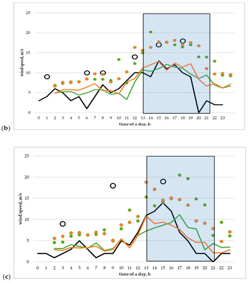 ICON-A6.5 (orange); ICON-A2 (green); observations (black): 10 m wind speed (curves) and wind gusts (circles) on 20 March 2020. (a) Airport Röst (67°31’ N, 12°06’ E); (b) Skrova lighthouse (68°09’ N, 14°39’ E); (c) Airport Stokmarknes (68°35’ N, 15°01’ E). Squares show time periods of the appearance of polar lows.