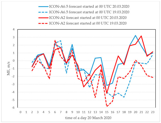 Mean Error (ME) of the ICON-A6.5 (blue) and ICON-A2 (red) forecasts of 10 m wind speed on 20 March 2020, for the forecasts with different lead times: starting at 00 UTC 20 March 2020 (solid line, 24 h forecast) and starting at 00 UTC 19 March 2020 (dotted line, 48 h forecast). ME is presented for three stations: Röst, Skrova, Stokmarknes.