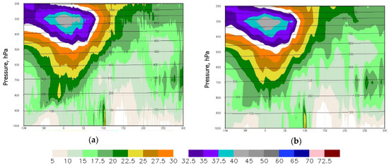 Figure 11 shows the vertical profiles of the wind speed modulus according to the model data. It can be seen that the maximum wind speed in the PL circulation (approximately near 925 hPa) corresponds to a high wind speed of 500 hPa (map of H500 is shown in Figure A4). In the case of modelling with a coarser resolution, both maxima are joined, and for higher-resolution modelling this relation is more complicated. As for the case of the PL of 26–27 November (Figure 7), the wind speed maximum is located near the level of 925 hPa, and the area of wind values exceeding 20 m/s in ICON-A6.5 is more extended than in the case of ICON-A2. The interaction with the H500 flow should be explored in future investigations. It is evident that the atypical tracking of this PL was due to its interaction with the middle troposphere dynamics.