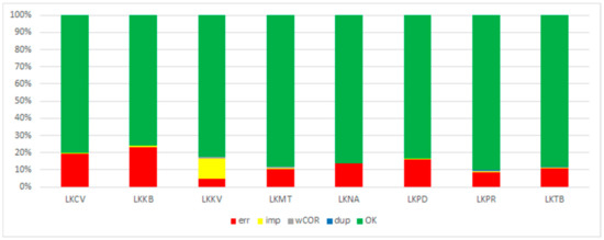 The occurrence of formal errors is assessed on approximately 1600 reports per station. The rate of flawless reports is relatively low, less than 10%. The reports with E errors account for 10% to 21% of all assessed reports. The largest proportion of errors is recorded at military stations LKNA (Náměšť nad Oslavou), LKKB, and LKCV, and the smallest error ratio is recorded at the stations LKPD (Pardubice) and LKPR. The remainder of the stations, about 80%, only registered W errors (Figure 3). The proportion of TAFs containing only E errors is designated E, TAFs containing only WARNING errors are labeled W, the proportion of TAFs containing both W and E errors at the same time is marked EW, and OK shows reports without either (1 December 2016–3 March 2018).