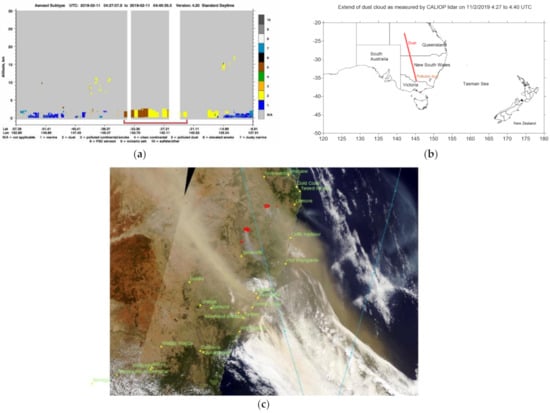 Extent of dust cloud as detected by satellites: (a) aerosol subtype vertical profile as derived from CALIOP measurements on 11 February 2019 from 4:27 to 4:40 UTC with CALIPSO satellite path above central Australia (b) Extent of dust cloud (red line) as measured by CALIPSO satellite on 11 February 2019 4:27 to 4:40 UTC. (c) MODIS Terra satellite image on 13 February 2019 of the dust cloud and hot spots (red) of wildfires in the northern New South Wales (NSW) area and the locations of the main towns and cities (yellow dots) (d) Maximum AOD Deep Blue Terra MOD08-D3 for the 13 February 2019 (source: Figure 6 in Nguyen et al., 2019) [26].