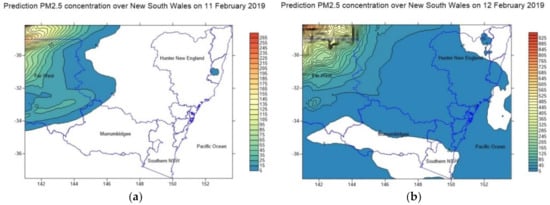 The prediction of PM2.5 and PM10 due to the dust storm and wildfires in northern NSW during the period of 11–15 February 2019 is less than the observed data at the monitoring stations in northern NSW, especially the peak values. In the metropolitan area of Sydney and at other stations (such as Gunnedah), the predicted values are comparable to observed data. The spatial predicted pattern is in line with satellite observation as shown in Figure 7.