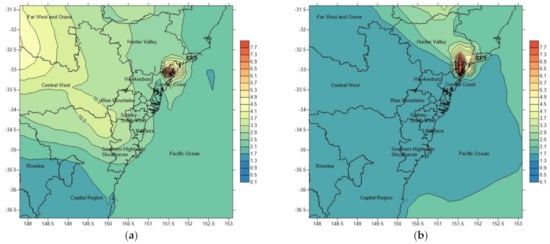 Note that as the predicted daily average of PM2.5 and PM10 does not exactly match the observed data measured at some points (monitoring stations) in the domain, the reported results here across the domain have some uncertainties due to the model and emission estimate errors. Nevertheless, we report here the estimated health impact to compare the relativity of the effect of dust storms in different Local Government Area (LGA) or regions in NSW. Local areas in the western NSW are mostly impacted in terms of particle concentration and exposure. There are also uncertainties in the epidemiological effect of dust on health as expressed by Equations (8) and (9). The Relative Risk (RR) are different in various studies. Al-Taiar and Thalib 2014 [53], in their study of the short-term effect of dust storms on the risk of mortality due to respiratory, cardiovascular and all-causes in Kuwait, have reported that there was no significant association between dust storm events and same-day respiratory mortality. That is, the RR is less and close to 1. However, for morbidity rather than mortality, in the previous study by the same authors, dust storms were significantly associated with an increased risk of same-day asthma and respiratory admission, with adjusted relative risk of 1.07 (95% CI: 1.02–1.12) and 1.06 (95% CI: 1.04–1.08) based on 10 µg/m3 increase in concentration of PM10. Barnett et al., 2012 [54] reported that there was an increase in emergency admission of 39% for one day storm event but no increase in respiratory hospital admission in Brisbane, Australia during a dust storm event originating from Central Australia in September 2009. One of the reasons given was that most people were prepared, implemented their asthma plans and sheltered indoors during the dust storm and this mitigated the effect of dust exposure. In a study by [55], they reported that there was no association of the 1998 Gobi Desert dust storm in Asia with respiratory admission in British Columbia due to the low impact from long range transport of dust. As for mortality, Ostro et al., 1999 [56] reported there is association between dust events generating PM10 and coarse particles and short-term mortality in Coachella Valley, California study while Schwartz et al., 1999 [57] showed that there was no association in their study of dust effect due to coarse particles on health in Spokane (U.S). However, for fine particles such as PM2.5, the association is stronger. In addition, the differences in the results reported by various authors are mainly due to the difference values of RR calculated for PM10 or PM2.5. Zhang et al., 2016 [58] in their meta study of desert dust effect on human health from literature also found that, for respiratory and circulatory mortality, both positive and negative associations have been reported for PM10, but only positive association was reported between PM2.5–10 (particulate matter of size between 2.5 and 10 µm) and mortality as well as between PM2.5 and mortality. It is clear, that fine rather than coarse particulate is associated with mortality. Our study uses fine particulate PM2.5 to assess the impact of desert dust on exposed population.