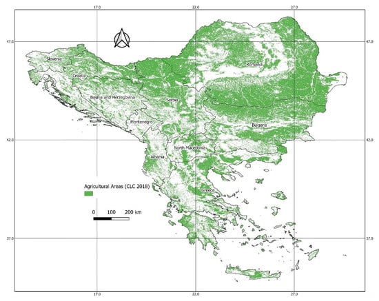 Table 2 provides us with some information about the number of grid points inside agricultural areas according to Corine land cover classification nomenclature [52], as a measure of the cultivated land per country. The study area’s sampling points used for this research are 1532, covering every area no matter if it is agricultural or not.